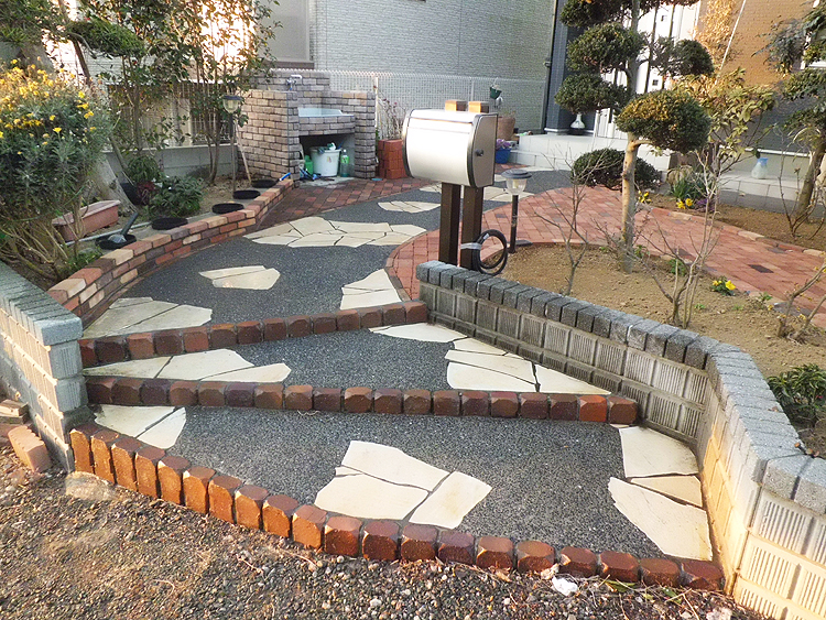 階段周りの単調さをレンガと枕木(コンクリート製)と砂利洗い出しを表現した例